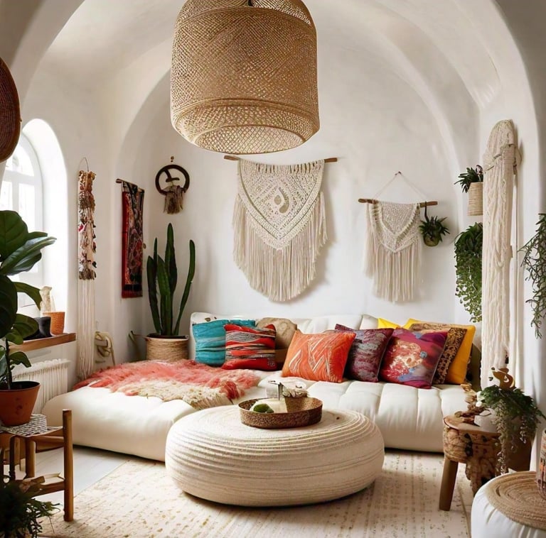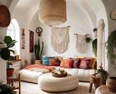 Textured Elements: Macramé wall hangings and woven accents add texture and visual interest.