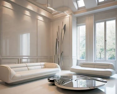 Organic Flowing Furniture: The gentle curves of the furniture add softness, balancing the sharpness of metallic accents and sculptures.