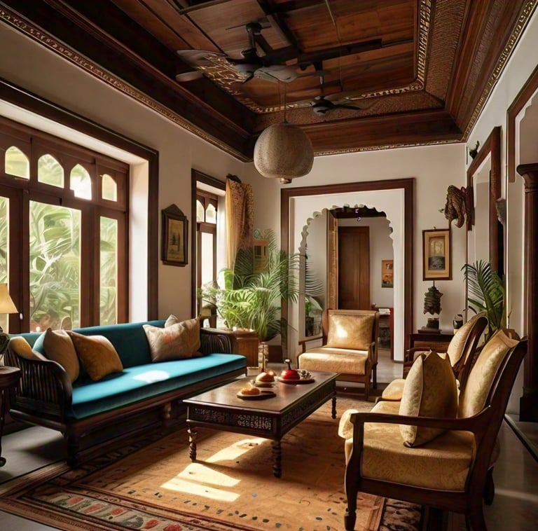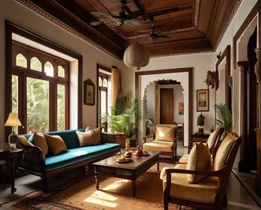 This image showcases a stunning Chettinad-style inspired interior, rich with elegance and traditional craftsmanship. It is a spacious, well-lit area with a mix of modern aesthetics and classical South Indian design elements. A striking orange and yellow chandelier serves as the centerpiece, adding a dynamic, artistic flair to the space. The large, arched windows allow natural light to flood the room, enhancing its sense of openness.