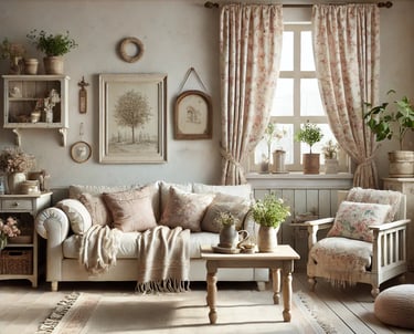 The image depicts a cozy living room with a shabby chic design for a middle-income group, featuring: