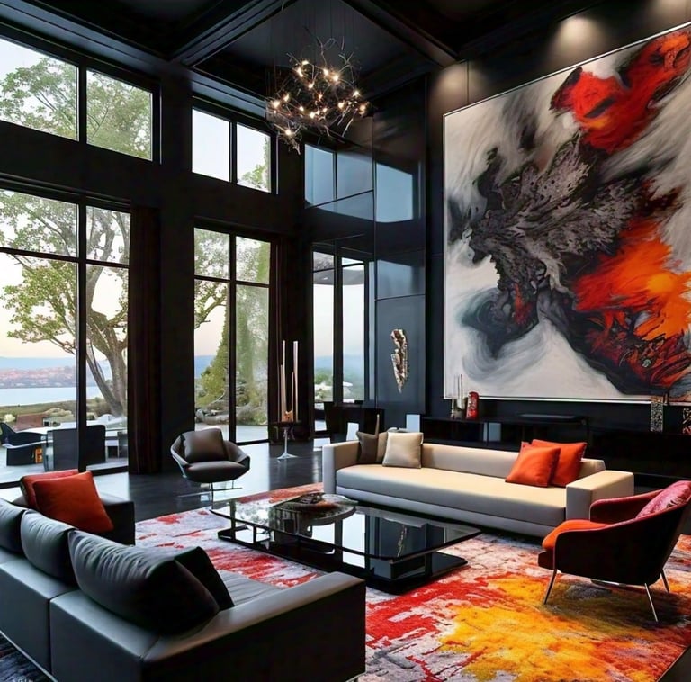 Color Palette: Neutral shades like black, gray, and cream, accented with bold red, orange, and yellow for contrast. The abstract painting and area rug add vibrancy.