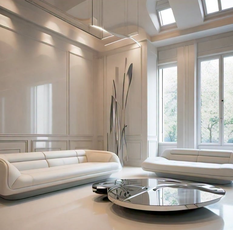 Metallic Accents: Sculptures and a reflective coffee table inject a modern, artistic touch.
