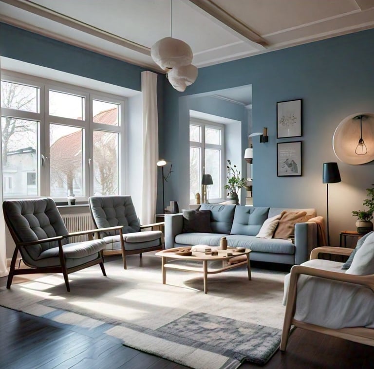 Color Palette: Soft, muted tones of blue and gray create a calm atmosphere, complemented by white curtains and ceilings that enhance brightness.