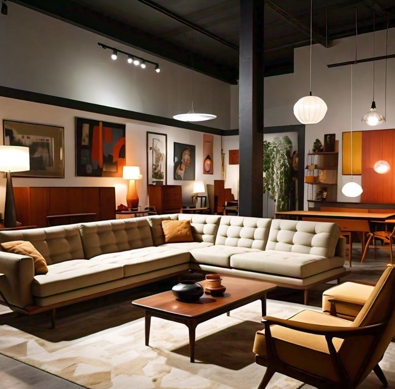 Geometric and Abstract Art: Bold, graphic artwork adorns the walls, typical of mid-century modern style.